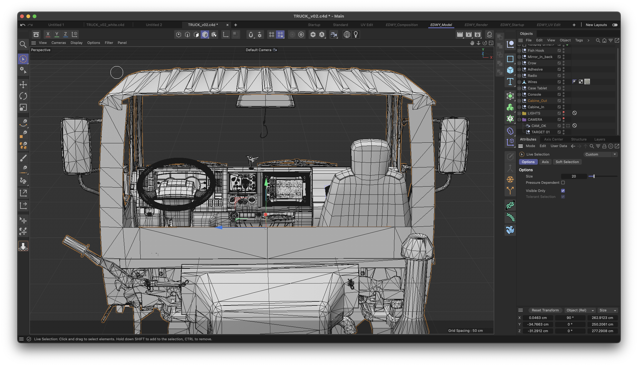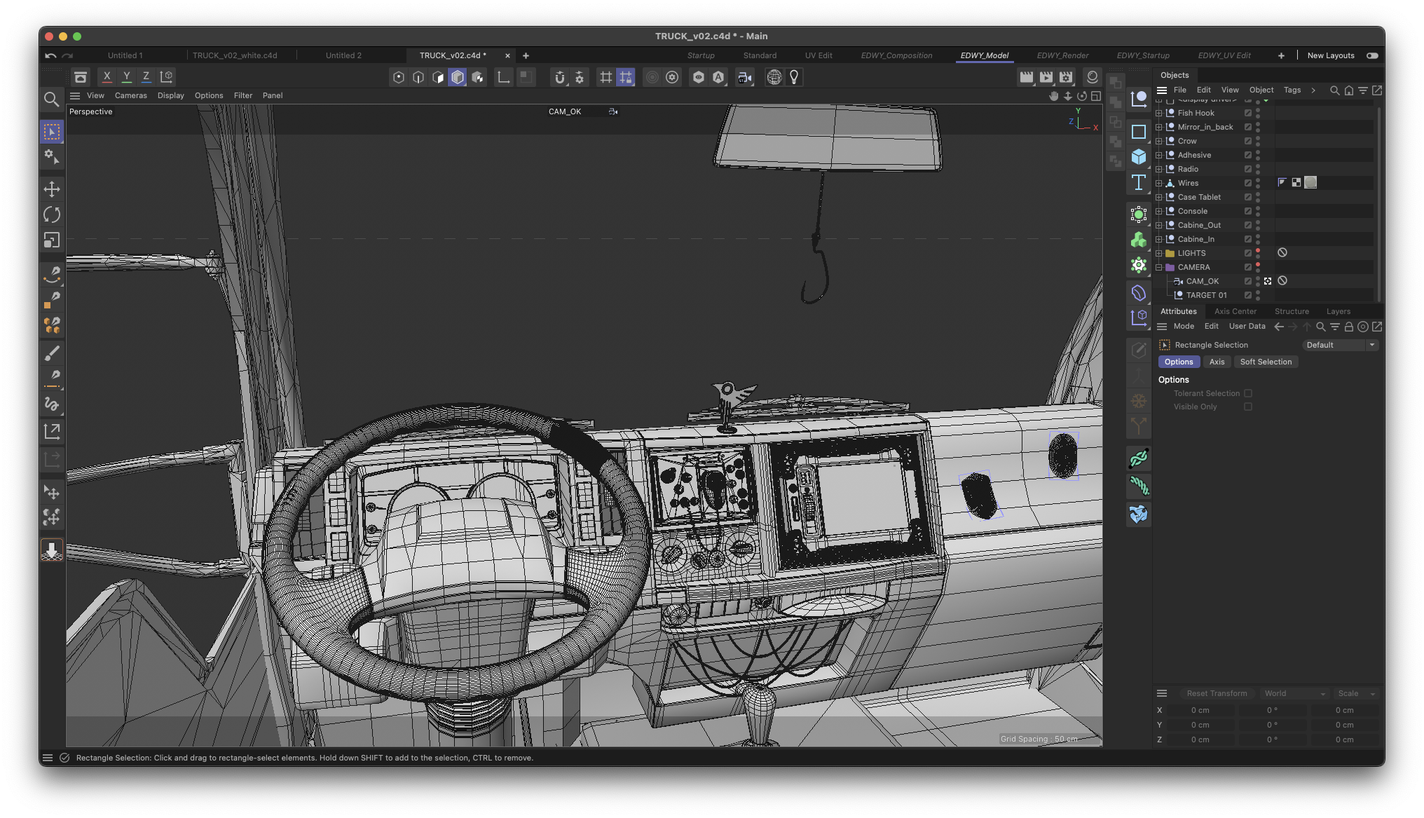 In Cinema 4D, sketches became geometry. Steering wheels, buttons, and cables were modeled into place.