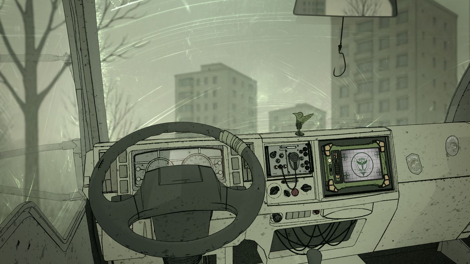 The last step happened in Photoshop, where the 3D world crossed into the 2D output we needed for the current build. Cracked and scratched windows are added, environmental fog gives it atmosphere and depth, and the city now looms beyond the windshield.